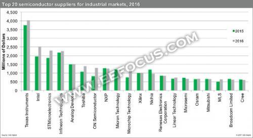 在预测2017年经济状况继续改善的同时,IHS Markit列出了以市场份额排名的工业半导体市场前20强。