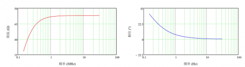 对于使用 EMI 接收器或频谱分析仪进行的测量,噪声信号可通过高通滤波器网络(如图 3 所示)获得,该网络的耦合电容为 0.1μF,放电电阻为 1kΩ,测量端口的端接电阻为 50Ω 。图 4 显示了在 150kHz 至 30MHz 的频率范围,(50μH + 5Ω) || 50Ω LISN 的模拟阻抗图。